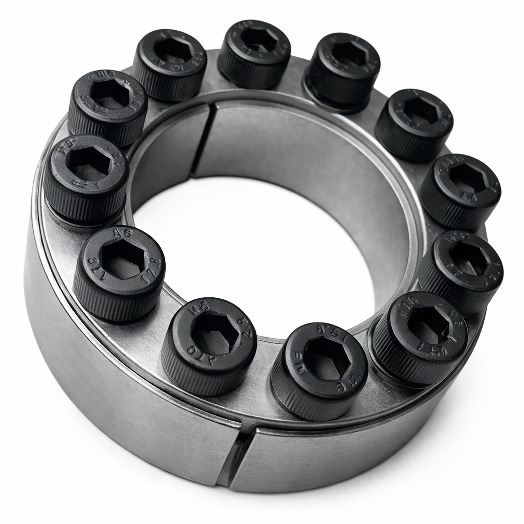 Composto por dois anéis cônicos bipartidos, anel interno e anel externo, o sistema cria uma união por atrito altamente confiável, dispensando chavetas e oferecendo maior tolerância de montagem. Ideal para acoplamentos industriais que exigem robustez, precisão e facilidade de instalação.
