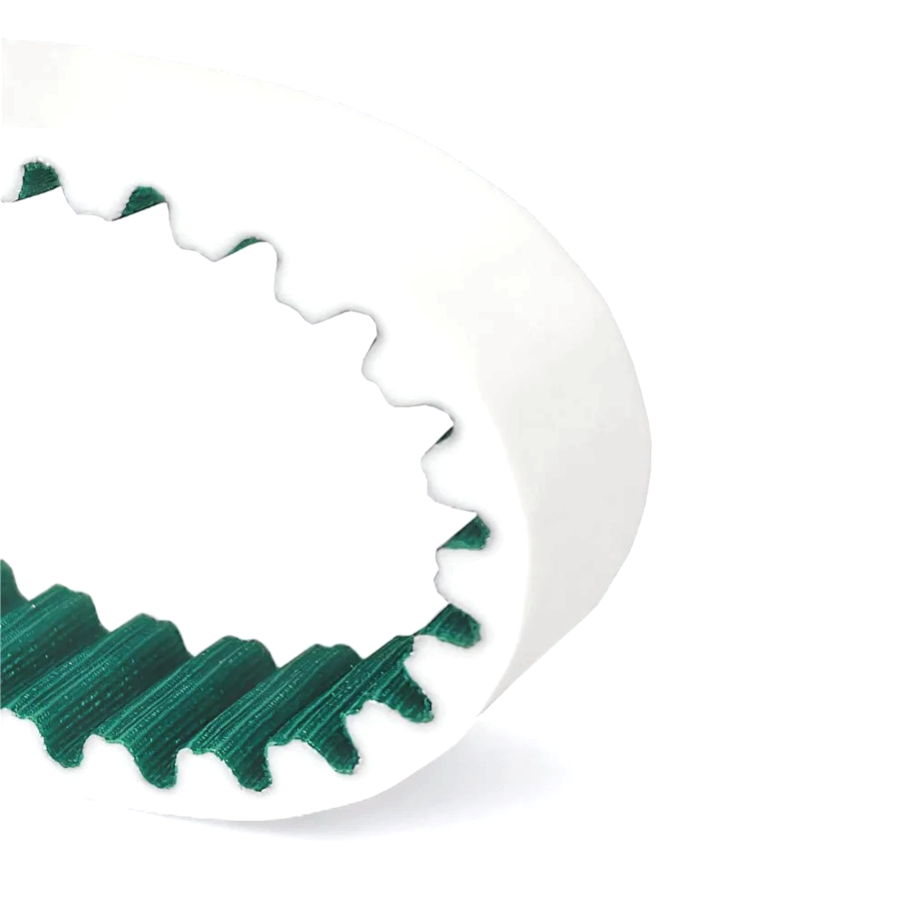 Revestimento NFT (Tecido de Nylon nos Dentes): A camada verde de nylon sobre os dentes (NFT) atua como um lubrificante seco. Isso reduz drasticamente o coeficiente de atrito entre a correia e a polia, diminuindo o ruído de operação e protegendo os dentes contra o desgaste abrasivo.
