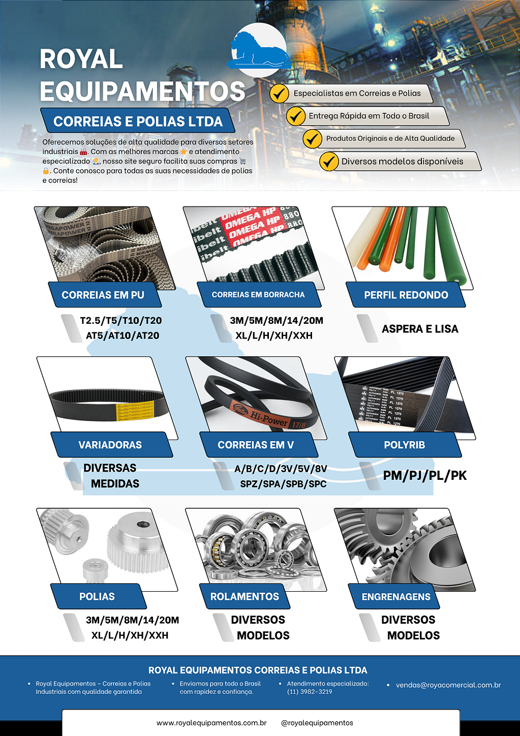 Bem-vindo(a) à nossa loja online de polias e correias! ⚙️ No www.poliasecorreias.com.br, oferecemos soluções de alta qualidade para diversos setores industriais 🏭. Com as melhores marcas ⭐ e atendimento especializado 👨💼, nosso site seguro facilita suas compras 🛒🔒. Conte conosco para todas as suas necessidades de polias e correias!